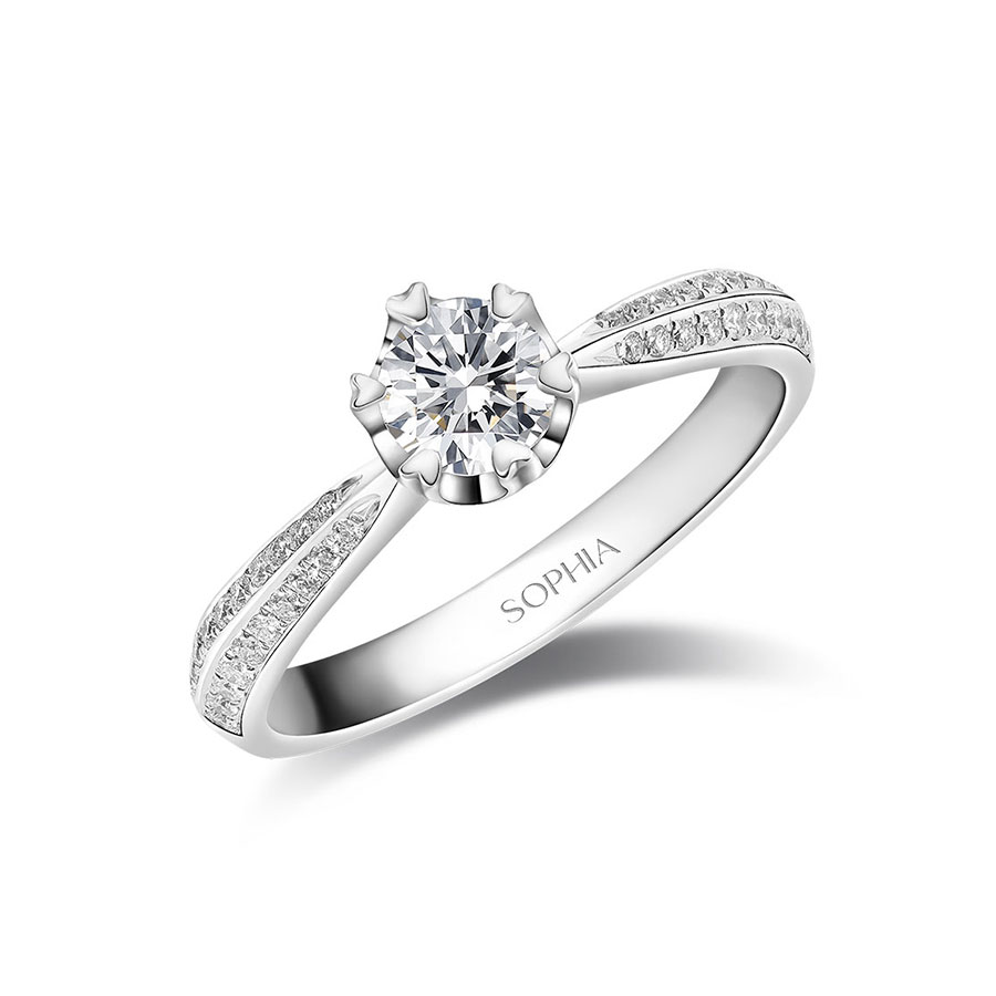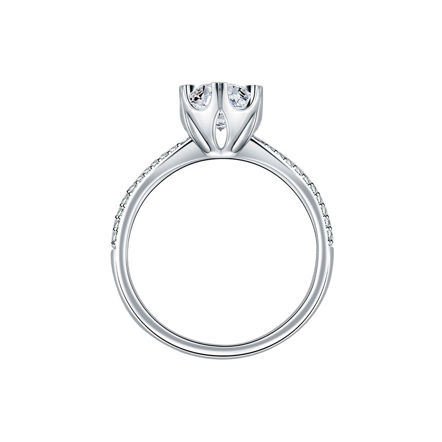 選用頂級成色、淨度與完美車工之鑽石,與鑲嵌工藝絕佳象徵-六爪皇冠鑲法相映成趣,心型鑽爪設計代表愛情的六個誓言:責任、承諾、包容、信任、呵護、珍惜。鏤空戒托增加自然進光量,多層次折射讓主鑽更顯光彩奪目,戒身兩排配鑽閃爍耀眼,代表兩人攜手前行的堅定以及愛情的完美無瑕。